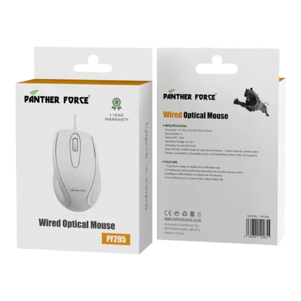 PF295 – Panther Force Wired Optical Mouse – High Precision Plug & Play – White